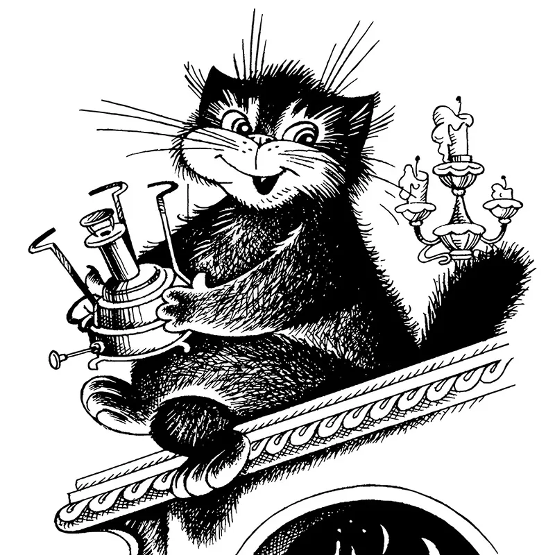 In 2011 (and since that year happened to be the Year of the Cat), Lavrentiy Anatolyevich Ivanov created several portraits of Behemoth the Cat for the website Petersburgskaya Dvornyazhka (The Petersburg Mongrel). Some may find the style of Soyuzmultfilm (Soviet animation studio) debatable when it comes to illustrating The Master and Margarita, but you and I are in favor of pluralism, are we not?